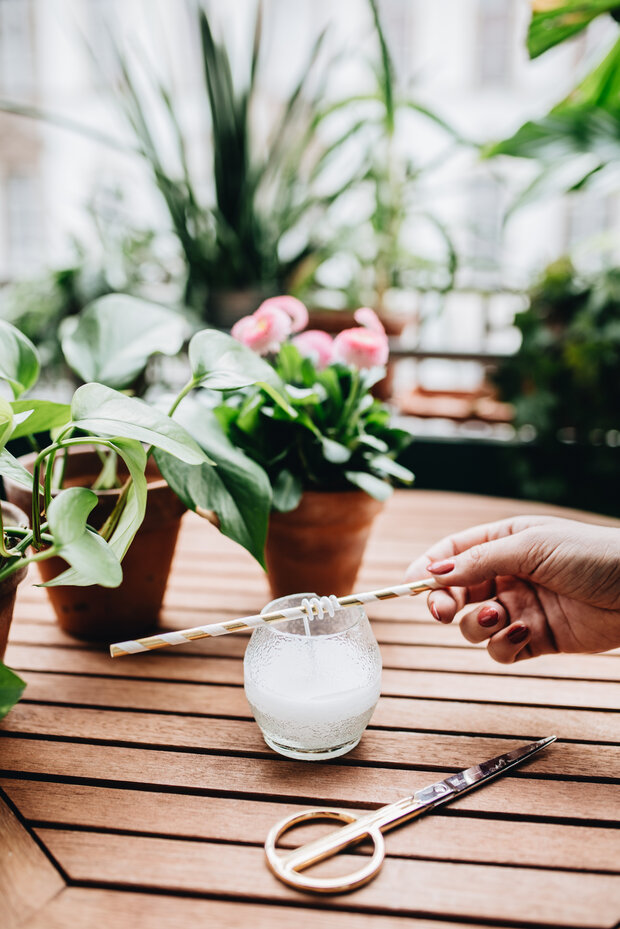 7. Nach ungefähr 20-25 Minuten müsste das Wachs fest sein. Du kannst dann den Strohalm wegnehmen und den Docht zuschneiden.