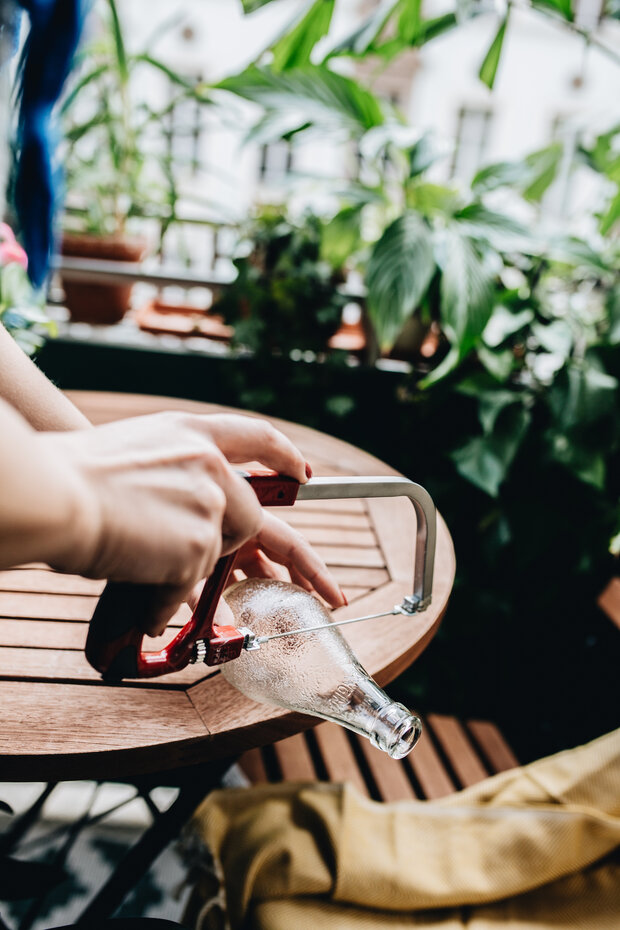 3. Fixiere die Flasche leicht an einem Tisch und halte sie gut fest. Zerschneide die Flasche mit der Glassäge ungefähr in der Mitte und halte die Flasche kurz unter warmes Wasser um die Glasspäne zu lösen.