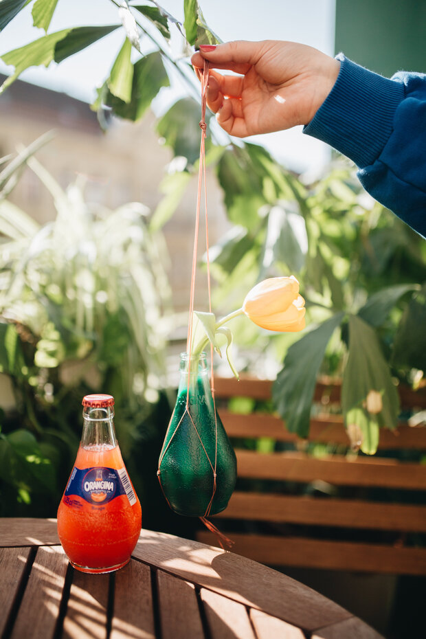 Folge dem Makramee-Trend und bastel dir deine eigene Orangina-Vase als hängendes Accessoire für deinen Garten oder dein Zuhause.