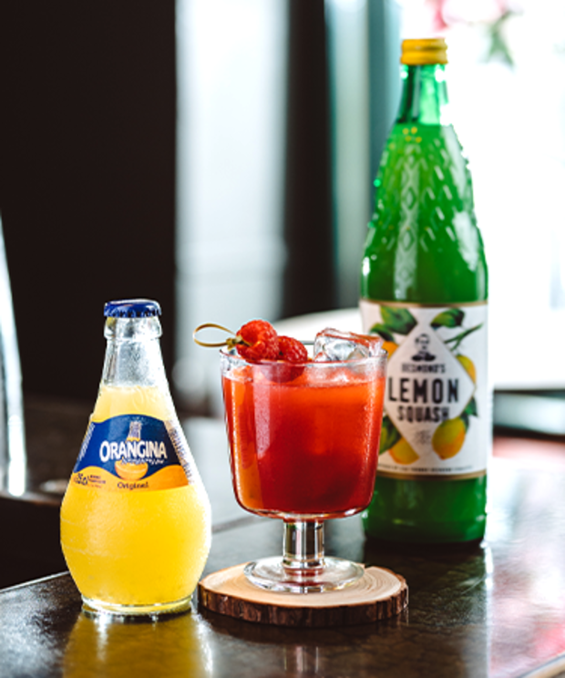 Das Himbeerpüree mit Eiswürfeln in ein Glas geben, Desmonds Lemon Squash dazu geben und mit Orangina Original auffüllen. Anschließend mit ein paar Himbeeren garnieren und genießen.